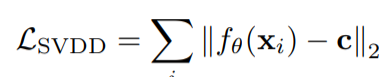 Deep SVDD는 구의 중심과 encoder를 통해 나온 feature vector 사이의 거리를 최소화 하는 방향으로 학습한다.