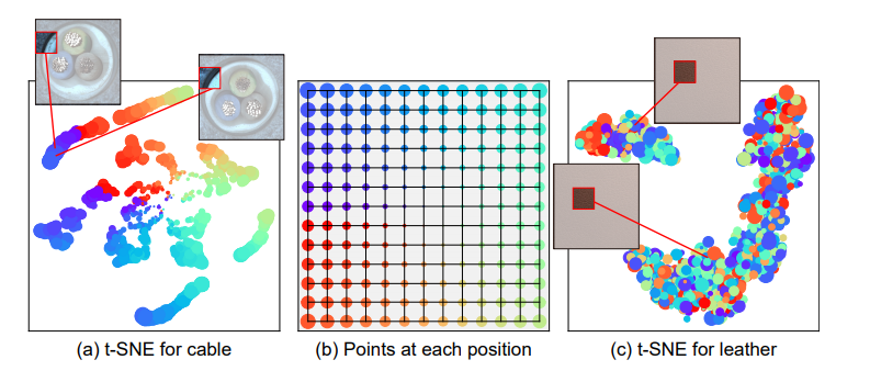 regularly positioned 클래스들(object class)은 비슷한 색깔과 사이즈의 point들은 비슷한 위치에 t-SNE가 찍힌다. (sementically similiar). 이는 같은 position에 있는 patch들은 비슷한 content를 갖는다는 것을 의미한다. ex) cable