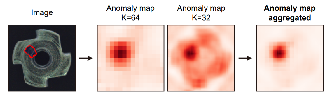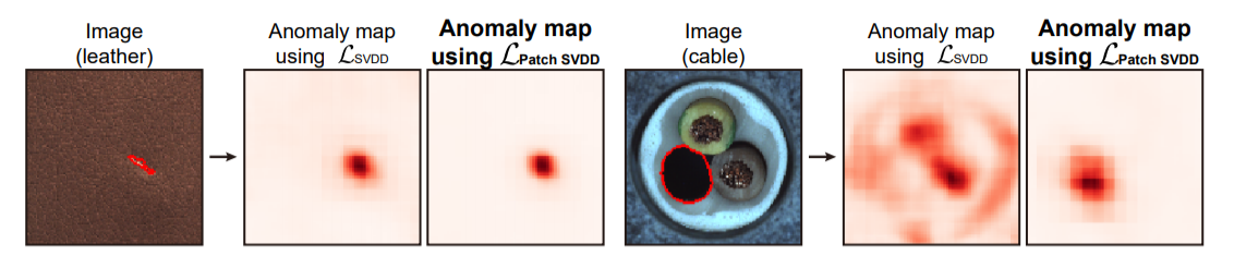 아래 그림은 Patch SVDD 모델을 통해서 나온 이미지 내에서 이상치 부분을 나타내는 것인데 multi-scale로 검출 결과를 뽑아내고 이를 결합해 이상이 있는 부분만 pinpoint 할 수 있게 된다.