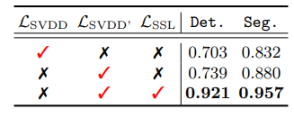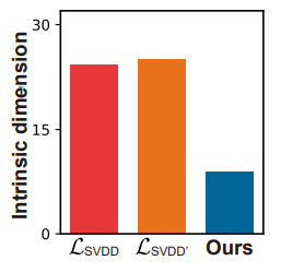 1) $\mathcal{L}_{\text {SVDD' }}$ ($\mathcal{L}_{\text {SVDD}}$를 개선 시킨 것)