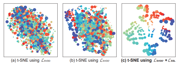 $\mathcal{L}_{\text {SVDD' }}$, ($\mathcal{L}_{\text {SVDD}}$는 uni-modal cluster를 형성하지 $\mathcal{L}_{\text {SSL}}$는 color와 size에 따른 multi-modal cluster를 형성한다.