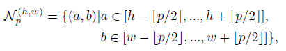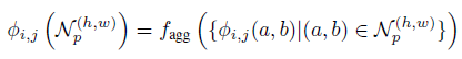 small spatial deviation에 강건하고 recpetive field size를 키우기 위해서 각 patch-level feature presentation을 구성할 때local neighbourhood aggregation을 사용한다. 따라서 아래와 같이 근접한 feature vector를 통합한다. $\phi_{i,j}(h,w)$는 아래로 바뀌게 된다.